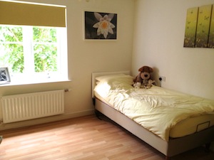 Once inside you have my hallway (below right) from which you can access all the rooms in my flat. All doors are wide Inspite of the wall sockets being lined up in the bedroom indicating that the bed should go in the middle of the room, I pushed the bed in the corner creating a big space for my showerchair and powerchair. Social Services funded a track hoist over my bed which enables me to have one carer/PA instead of two. I control the light, lamp, wheelchair battery charger and fan on top of the wardrobe using my Hive. I also have an adjustable bed so I can sit up to read/watch tele or take medicaton in bed - I can't sit up on my own steam. After repeated requests from carers/PAs whose backs suffered after hoisting me into a standard-height bed, I bought a height adjustable double bed from Betterlife from Lloyds Pharmacy. See pictures below.