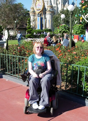 A few years after being diagnosed with FA I started using a wheelchair first for distances (I remember using it on school trips and my friends pushing me to and from school in it) and then when I made the transition to high school I used the chair to take me from lesson to lesson as I worried (or rather my parents worried) that I wouldn't be accepted in high school if I walked around in the way that I did back then. Although I resented them at the time for pushing the use of a wheelchair around school I know now it was a good move. If you look up ataxia in a dictionary it will define it as "loss of the ability to coordinate muscular movement" or similar. One way to induce ataxia is to drink too much and after a few too many you will find that you begin to walk much like I did. After my Scoliosis surgery I used my chair at all times outside the house. The surgery involved four weeks of bedrest in hospital and after that time I had to learn to walk again. I was very weak and lost a lot of weight. I also lost a lot of ability which I never regained - the co-ordination in my legs took a steep dive. Inside the house I still wobbled and staggered from A to B, using walls and furniture to steady myself. I was a bit like a human pinball at this stage as I would bounce from wall to wall until I got where I wanted to go. I couldn't walk in an open space as I needed something to hold onto. I guess because my sense of balance was so poor I needed something to hold onto to give me that sense of balance that I didn't have myself. Over the next few years I was falling more and more often. Most afternoons I'd come home from school, plonk myself on the sofa, and ask everyone else to bring things to me as I needed them. It wasn't that I was lazy, it was just so much easier that way then walking there and getting it myself. I lost out on so much when I should of been enjoying being a teenager but I was so afraid of using a wheelchair all of the time and I just didn't want to let go. Wheelchairs are strange things; to somebody who isn't a wheelchair user they represent something terrible - a horrible accident or a debilitating disorder. To someone who needs one a wheelchair removes barriers and promotes ability and independence. I just had to move from one mindset to the other. I began using the wheelchair full-time when I was 14 and I didn't look back. I'm so much more able and independent with my wheels, and so much happier. But I was soon to find that even more independence could be found in using my powerchair. When I first got my powerchair (I was about 14 at the time) I can remember thinking "only severely disabled people use powerchairs". That wasn't something that I wanted to be so I didn't really use it until I started college - I didn't really want to depend on friends to push me in my manual chair when I got tired or came to a ramp that was too steep etc., As well as gaining a lot of independence from using a powerchair it was amazing how much more energy I had in college compared to when I was at school and pushed myself great distances in my manual wheelchair. The powerchair that saw me through college and the first few working years of my life was a big, clumsy and quite basic powerchair which didn't have much battery power. The powerchiar itself was actually quite limiting as it couldn't be taken in small spaces or long distances. When I was 21 I got a mid-wheel drive powerchair (a Jazzy 1121) which was great as it turned on a dime and the battery lasted forever. With it I was able to go on buses and trains and go out for the day. As you can see from the picture on the right I even took it on holiday to Walt Disney World and I was able to enjoy it so much more because of the freedom I had. Now I use an Invicare TDX2 powerchair and in this chair I can elevate the legs, rise, tilt, recline. See the my powerchair page for more info.
